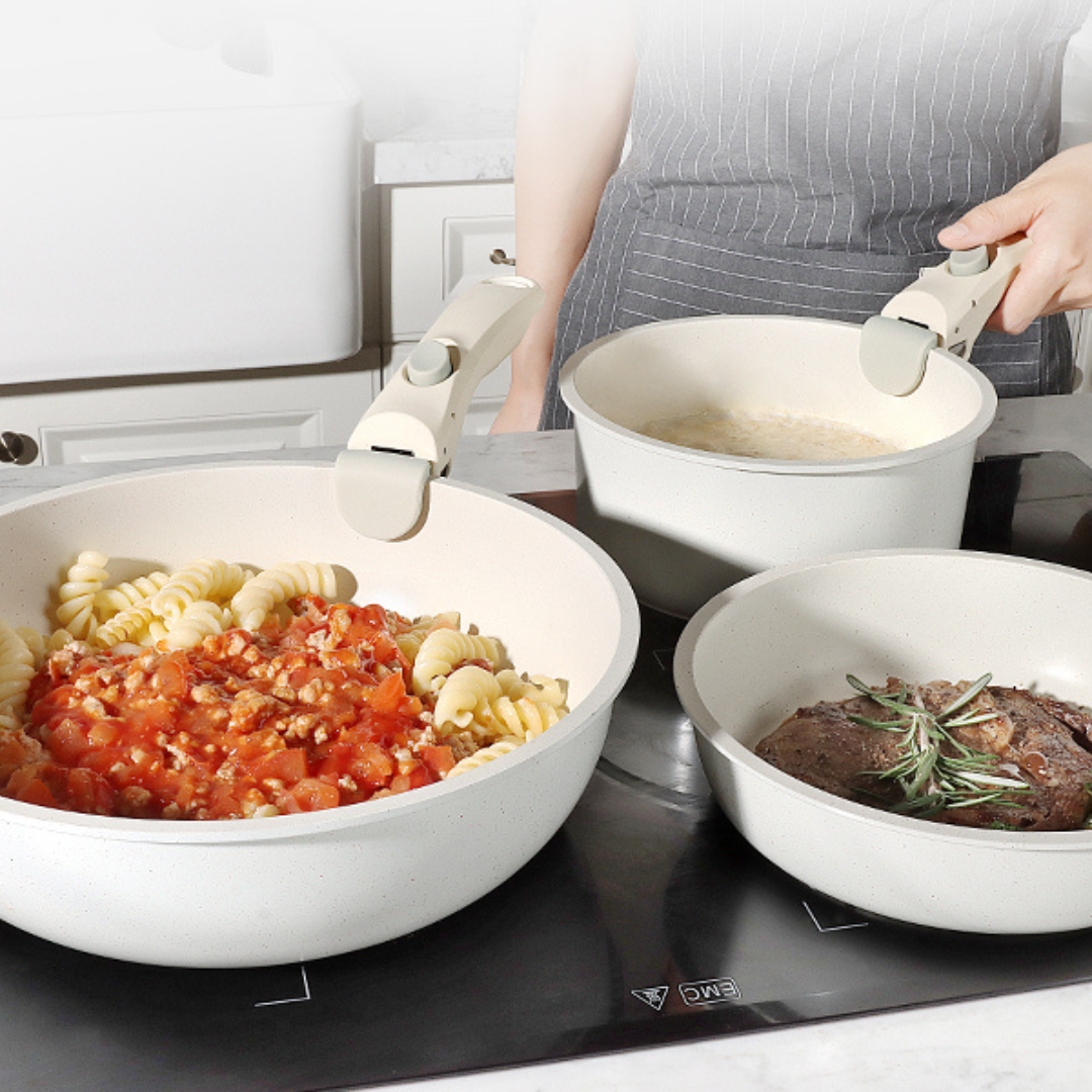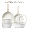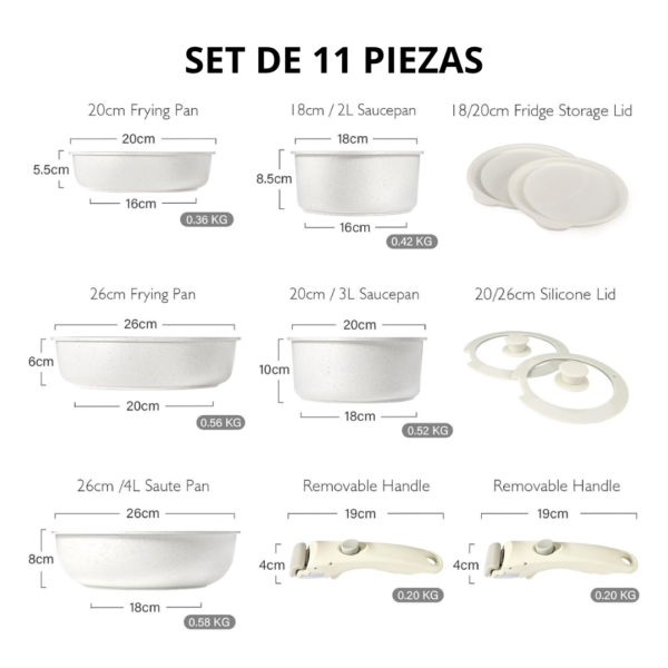 Batería de cocina de 11 piezas, ideal para cocinar de forma práctica y ahorrar espacio. Cuenta con recubrimiento de cerámica y base de acero inoxidable, compatible con estufas de inducción y otros tipos de cocina. Su diseño con mangos removibles facilita el uso, almacenamiento y limpieza, además de permitir llevar algunas piezas directamente a la mesa o guardarlas de forma más compacta.