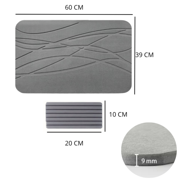 Set de alfombra de diatomita ideal para mantener tus espacios más secos, limpios y ordenados. Es perfecta para la salida del baño, área de lavamanos, escurridor de platos o cualquier lugar donde se acumule humedad. Su material ayuda a absorber el agua rápidamente y secarse en poco tiempo, reduciendo la sensación de humedad constante. Además, la alfombrilla pequeña es ideal para colocar jaboneras, vasos de cepillos de dientes o dispensadores, ayudando a mantener la superficie más limpia y protegida.