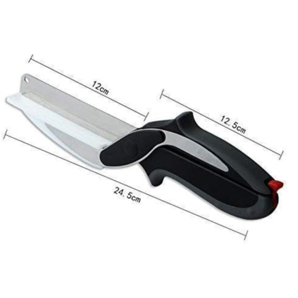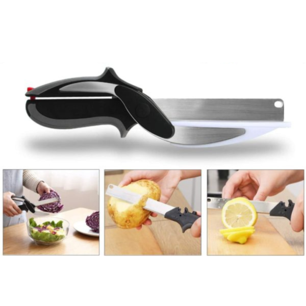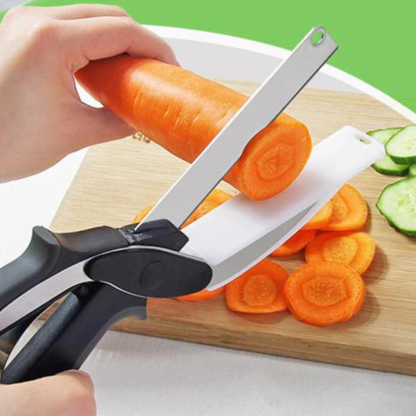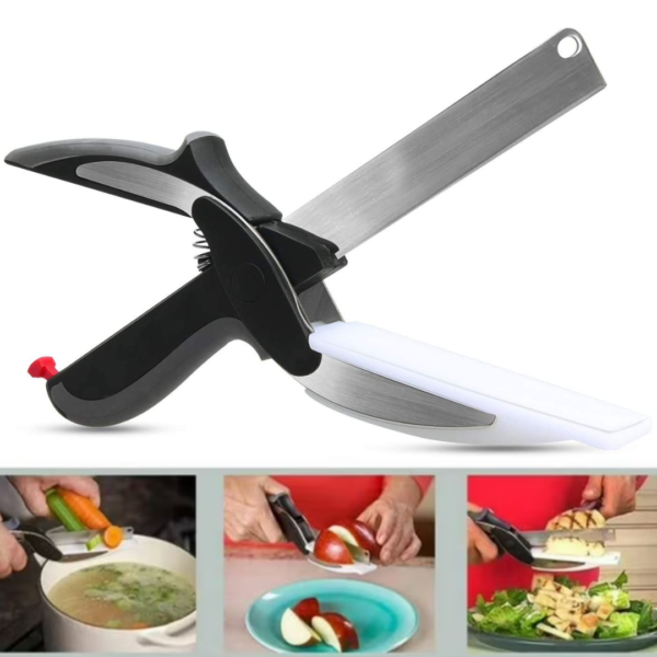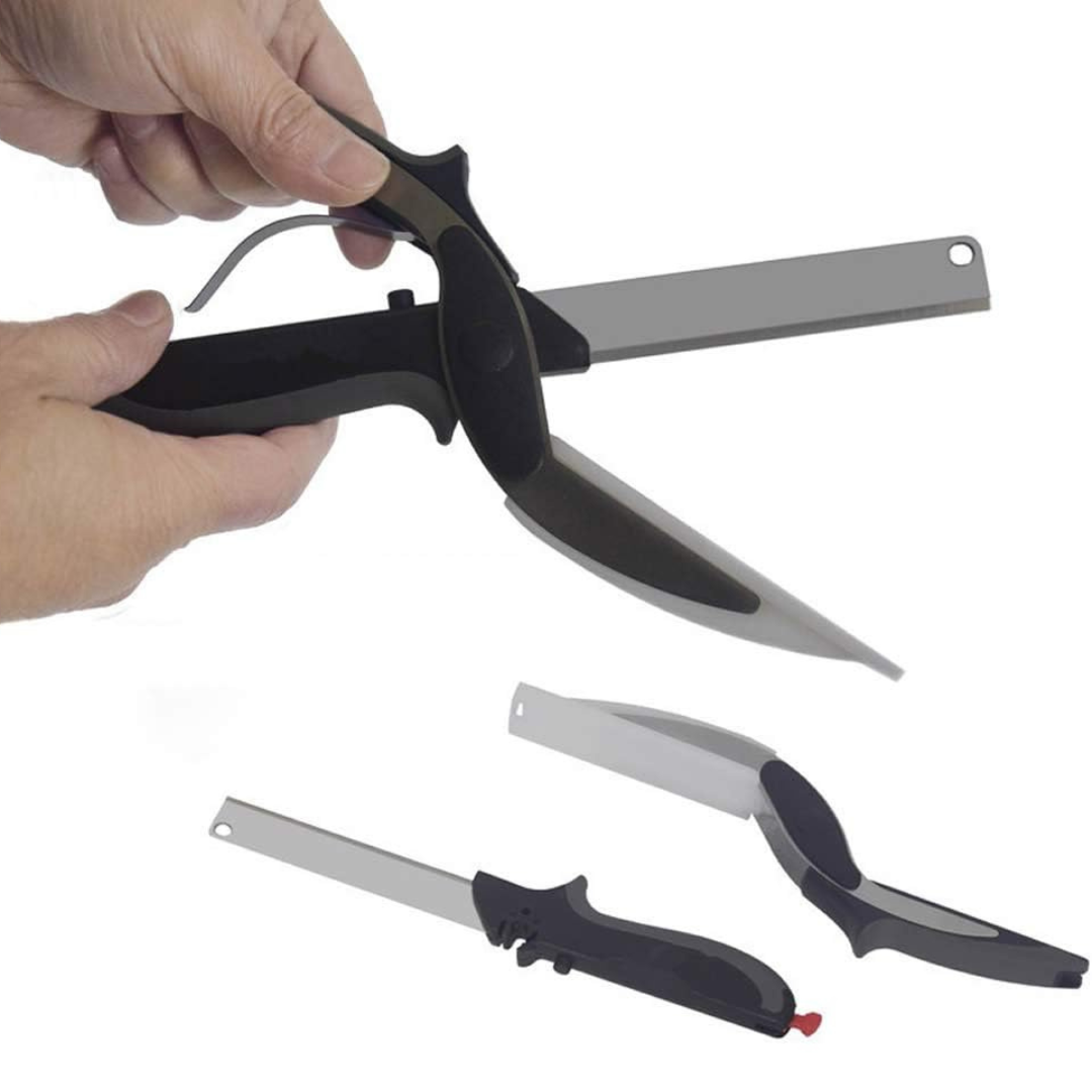Tijeras 2 en 1 ideales para cortar y picar alimentos de forma más práctica en la cocina. Su diseño combina tijera y cuchillo en una sola herramienta, facilitando el corte de vegetales, frutas, pan u otros alimentos con mayor control y comodidad. Además, son una opción útil para preparaciones rápidas y para quienes buscan ahorrar tiempo al cocinar.